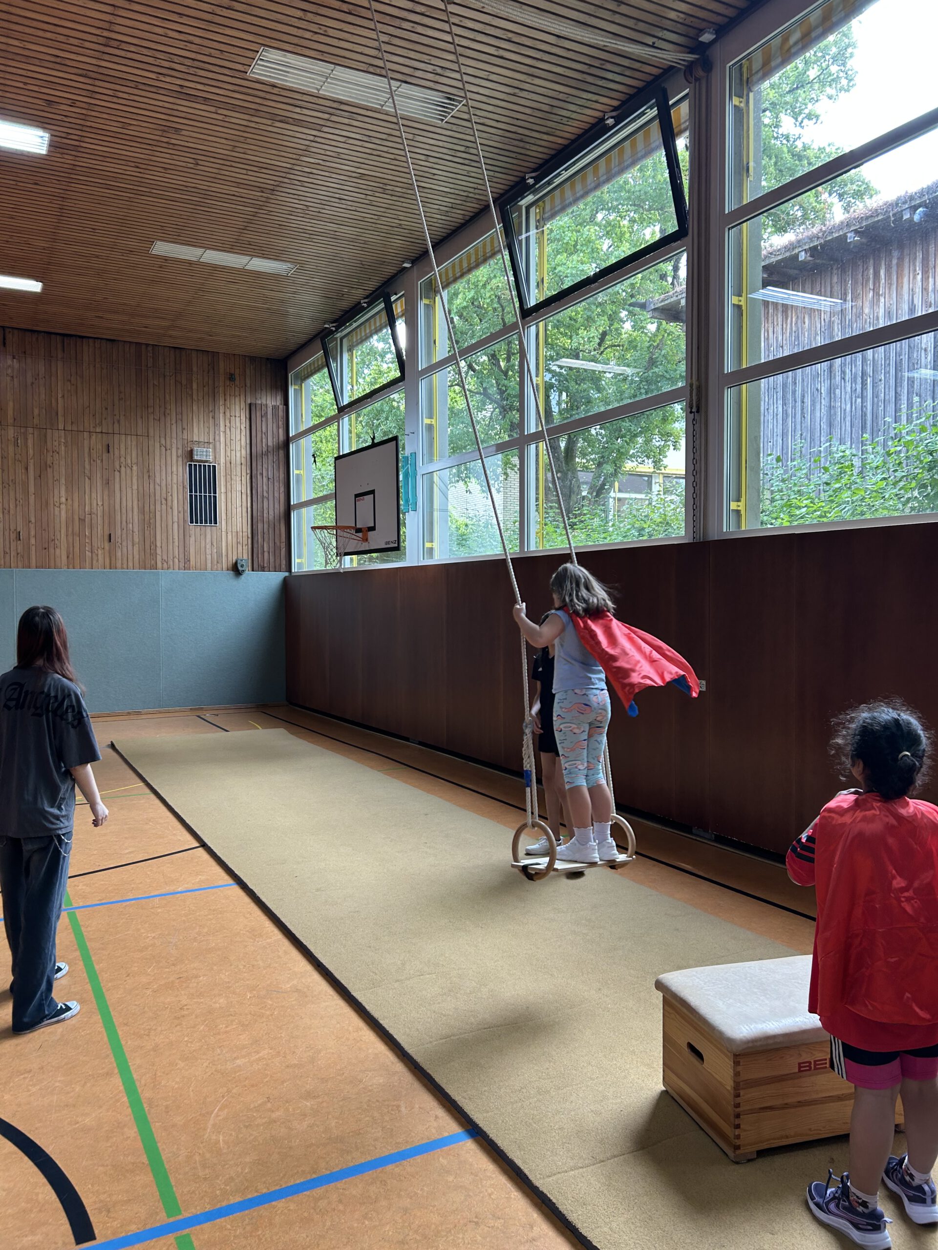 Mit einem Superheldenschild und farbenfrohen Augenmasken, ging es ans Klettern, Balancieren, Springen, Fliegen, Werfen und sogar durch das geheimnisvolle „Tal der Zerstörung“. Jede Station war individuell gestaltet – mit sportlichen Aufgaben, kreativen Details und kleinen Geschichten rund um die Superheld*innen. Sogar ein originalgetreuer Thor-Hammer stand bereit!
